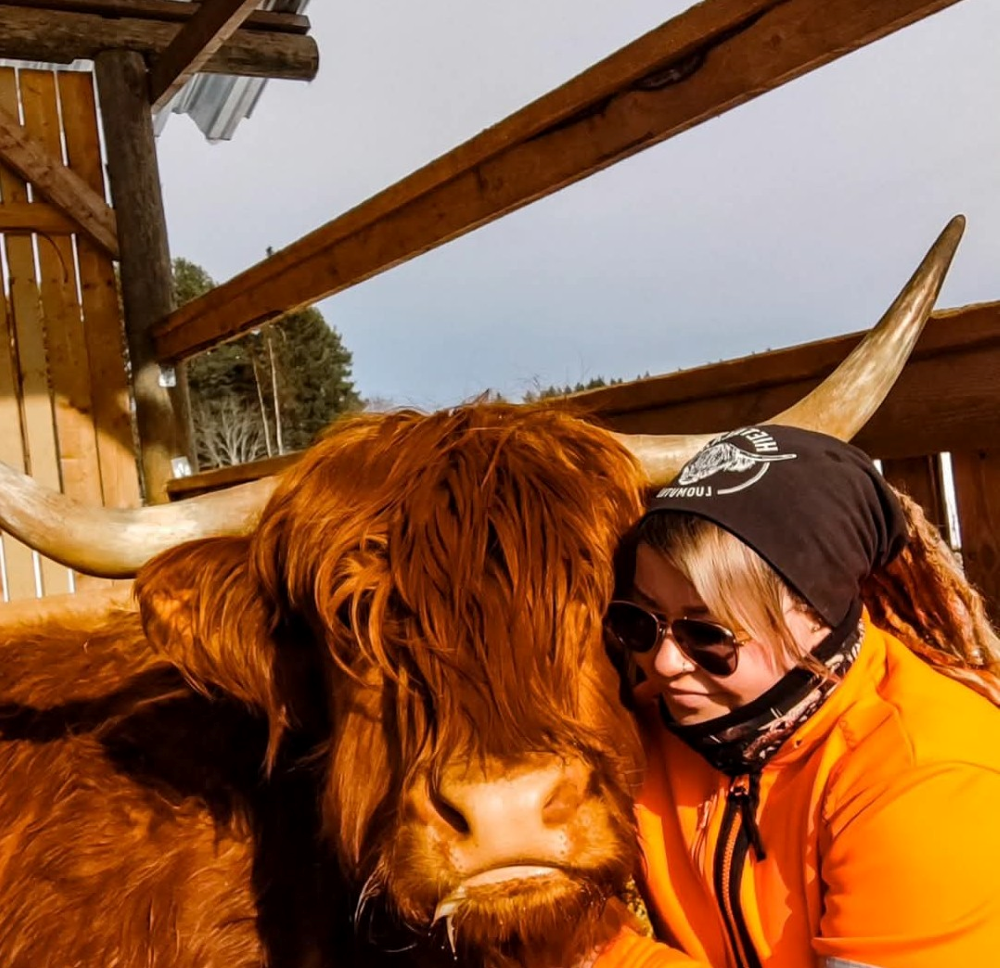 Hietalan luomutilan emäntä makoilee ylämaankarjan lehmän selässä laitumella.